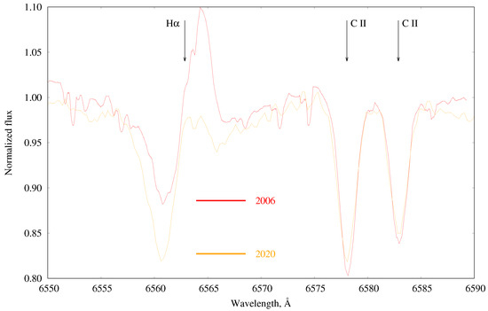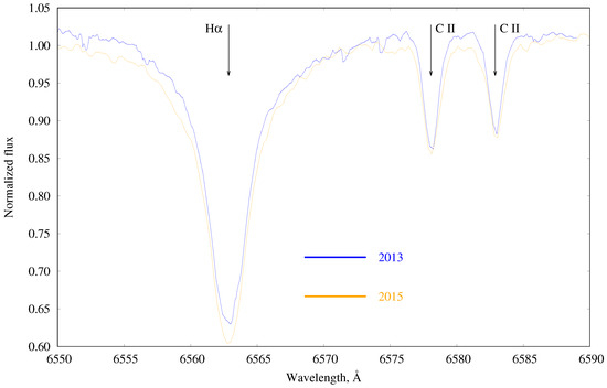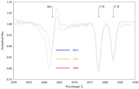 In order to show the H variability in our targets, we have collected previous observations in CASLEO, depicted in Figure 2, Figure 3 and Figure 4; from 15 January 2006 for HD 42087; 5 February 2013 for HD 52089; and 15 January 2006 and 5 February 2013 for HD 58350.