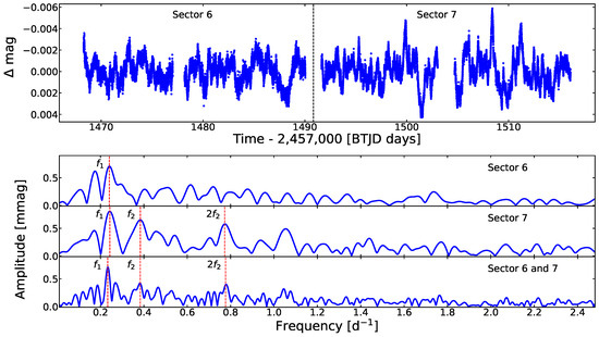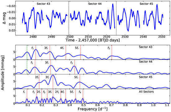 This star was observed in 3 consecutive sectors: Sector 43, in the period from 16 September to 10 October 2021; Sector 44, from 10 October to 6 November 2021; and Sector 45, from 6 November to 2 December 2021, covering an observation time span of 24.287 days, 24.156 days and 24.551 days, respectively. The light curve and the amplitude spectra for the individual sectors and all sectors combined are displayed in Figure 5.