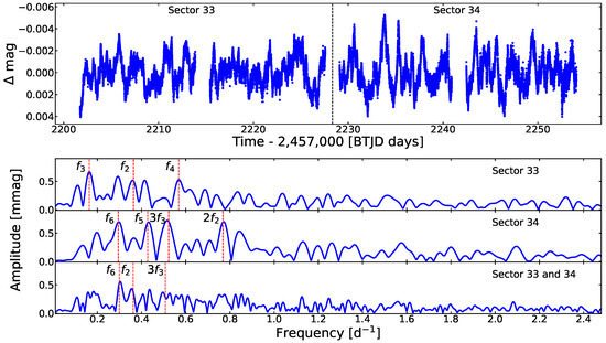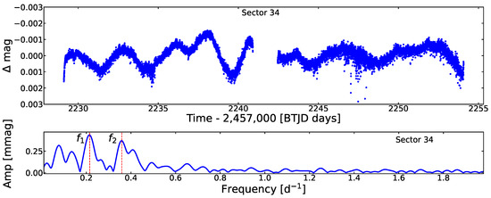 This star has been observed in Sector 34 in the period from 14 January to 8 February 2021, covering a total timespan of T = 24.96 days. The light curve for Sector 34 is displayed in the top panel of Figure 8, and we show the amplitude spectra in the lower panel.