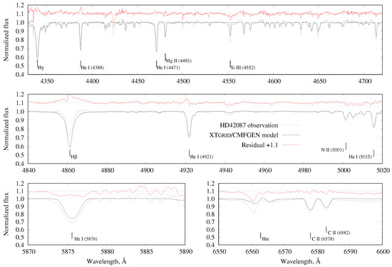 Best-fit XTgrid/CMFGEN model for HD 42087. In each panel, the CASLEO observation is in grey, the CMFGEN model in black, and the residuals, shifted by +1.1 for clarity, are in red.