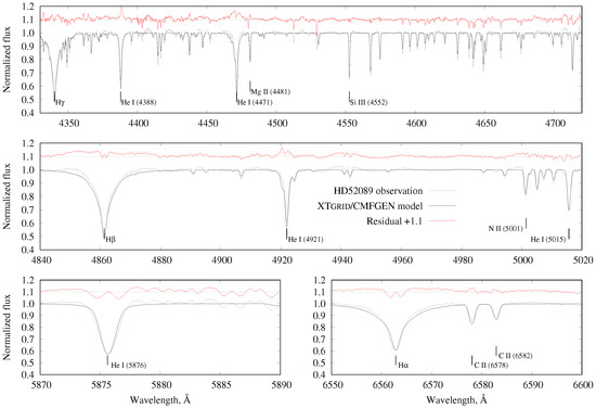 Best-fit XTgrid/CMFGEN model for HD 52089. In each panel, the CASLEO observation is in grey, the CMFGEN model in black, and the residuals, shifted by +1.1 for clarity, are in red.