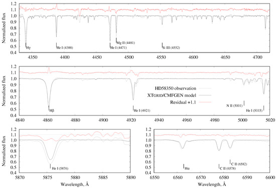 Best-fit XTgrid/CMFGEN model for HD 58350. In each panel, the CASLEO observation is in grey, the CMFGEN model in black, and the residuals, shifted by +1.1 for clarity, are in red.