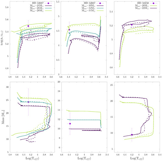 Left panels: HR diagram (top) and mass evolution (bottom) showing the position of HD 42087 and evolutionary tracks with initial masses of 24, 26, and 28 . Middle panels: The same as in the left panels for HD 52087 and initial masses of 10, 12, and 14 . Right panels: the same as before for HD 58350 and initial masses of 20 and 22 . Solid and dashed lines represent models with 0.568 from [22] and the interpolated ones for 0.4, respectively.