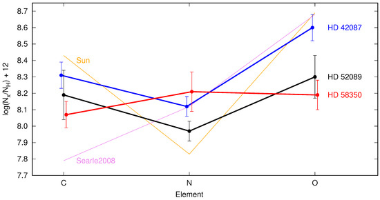 - Lyubimkov, L.S.; Lambert, D.L.; Poklad, D.B.; Rachkovskaya, T.M.; Rostopchin, S.I. Carbon, nitrogen and oxygen abundances in atmospheres of the 5–11 M⊙ B-type main-sequence stars. Mon. Not. RAS 2013, 428, 3497–3508. [Google Scholar] [CrossRef]