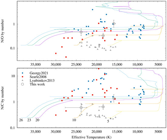 - Morel, T.; Hubrig, S.; Briquet, M. Nitrogen enrichment, boron depletion and magnetic fields in slowly-rotating B-type dwarfs. Astron. Astrophys. 2008, 481, 453–463. [Google Scholar] [CrossRef]