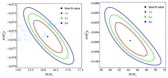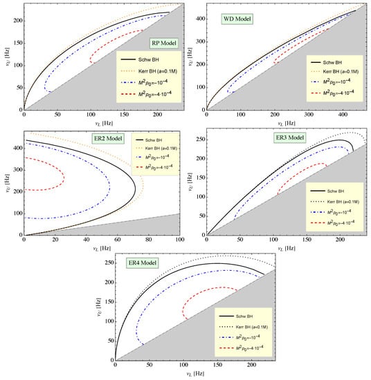 - Epicyclic resonance (ER) model: This model is based on the resonances of modes of axisymmetric oscillations in the accretion disk of black holes [42]. It has been demonstrated that the oscillation modes of the disk are related to the frequencies of harmonic (quasi-) oscillations of circular geodesics of test particles. We consider two submodels within the ER model: ER2 and ER3, which differ in their oscillation modes. The upper and lower frequencies in the ER2 and ER3 models are given by and , and and , respectively, [42].