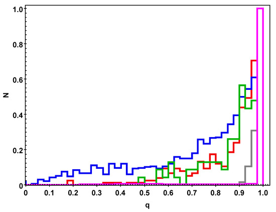Kepler’s Third Law allows one to calculate the total mass (the so-called dynamical mass) of a binary system, for which the period, semi-major axis and trigonometric parallax are known (this information is usually available for orbital binaries, i.e., visual binaries with orbital solution). Alternatively, individual masses of (at least main-sequence) components (so-called photometric mass) can be calculated from their visual brightness, trigonometric parallax, interstellar extinction, and the mass–luminosity relation. This was performed by [8] for 3350 objects from the most complete and representative source, the sixth catalog of orbits of visual binary stars, ORB6 [9]; of which 326 of them demonstrate a decent agreement between dynamical and photometric masses. Their q-distribution is represented by the red histogram in Figure 1.