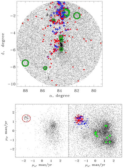 Figure 1 (bottom-right panel) represents these sources on the PMD, and Figure 1 (top panel) represents the sources on the α δ . In both figures, we mark the location of known open clusters. They are multiple and overlap at the projection (Figure 1, top panel); however, in Figure 1 (bottom-right panel), one may see that the probable location of Group V (marked in red) is well separated from the concentrations of sources identified as probable members of the open clusters.