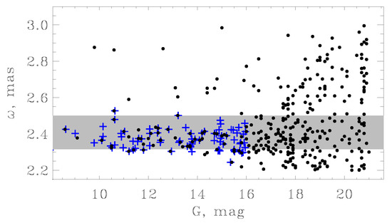 Figure 2. Parallax-magnitude diagram for the stars of our initial sample (black dots, n = 330). The blue crosses show the stars of Dataset B. The gray strip in parallaxes 2.32 mas ϖ 2.50 mas is limiting the Dataset A.