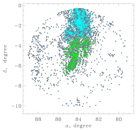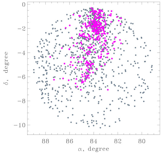 Independently, we used the unsupervised clustering algorithm described in [23] to reveal the extended groups of stars sharing common motion. This includes the search for pairs of stars with a projected separation S p r o j below an established maximum and a difference in tangential velocities Δ V t less than an accepted value. After the catalog of such pairs is compiled, the DBSCAN algorithm [24] is applied to it. This scheme proved to be effective for spatially extended stellar structures. In the present case, the limiting value for the projected distance between the components of a pair was set to S p r o j < 5 pc, and the difference in tangential velocities was selected as V t < 1 km/s. These limits are quite strict, which is motivated by the complicated nature of the Orion region and numerous prospective sources of contamination. As a result, two clusters of sources are selected (due to their spatial separation), as presented in Figure 4. The joint dataset selected with the clustering algorithm includes 737 sources. The clustering algorithm here helps to define the position of the group of stars in the spatial coordinates.
