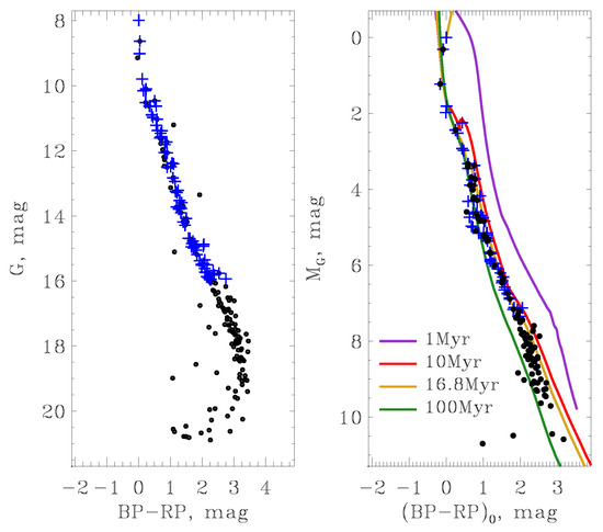 We used the isochrones obtained from the Padova webserver CMD3.3 2 based on the calculations by [22] for solar metallicity Z = 0.0152 , to estimate the age of Group V. Figure 5 (left panel) represents the color–magnitude diagram of the Dataset A, and Dataset B. To pass to de-reddened values, we used Gaia DR3 estimates of A G , E ( B P R P ) . They are available for 100 stars from Dataset A with G m a g > 18 . The absolute magnitudes of the stars were calculated using Gaia parallaxes. Figure 5 (right panel) represents the resulting de-reddened diagram in absolute stellar magnitudes. The overlaid isochrones are for 1 Myr, 10 Myr, 16.8 Myr, and 100 Myr. The locations of the sources of Dataset A agree well with the age of about 16 Myr ( log t 7.2 ± 0.3 ).