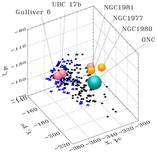 Figure 6. Three-dimensional distribution of the stars of Group V. Dataset A—black dots; Dataset B—sky blue crosses. The balls indicate the positions and approximate characteristic dimensions of the OSCs. The color of the balls indicates the age of the OSC: the age increases from blue to orange and to red. The ages of the clusters range from 1 million years (ONC) to 17 million years (Gulliver 6).