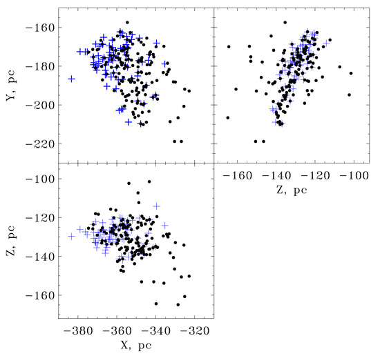 Figure 6 shows the distribution of stars in Dataset A ( n = 150 ) and in Dataset B ( n = 83 ) in the Cartesian coordinate system. The distances of stars from the Sun, determined by the classical parallax formula, were used. The nearest OSCs located in this region of space are also shown. A rectangular galactic heliocentric coordinate system is used, in which the X axis is directed to the Galactic Center (l = 0 , b = 0 ), the Y axis is in the direction of the Galaxy rotation (l = 90 , b = 0 ), and the Z axis is directed to the North Pole of the Galaxy (b = 90 ). The same coordinate system is used for spatial velocities.