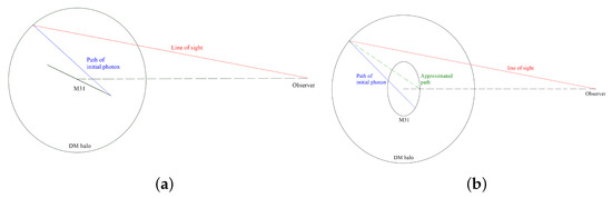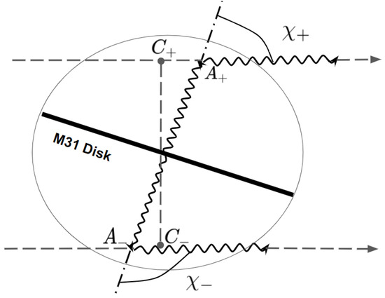 In this 3D model, however, is not considered to be constant and can be varied, depending on the coordinates of the point of initial photon production and the point of scattering. The value of the energy rises with the decrease in , so the maximization of from Equation (9) is reduced to maximizing the scattering angle (which can change in range from zero to 180) for each observer’s line of sight with specific angular coordinates b and l. It was found that reaches the maximum if scattering takes place in the furthest possible point along the line of sight, while the photon starting point is situated at the disk rim on its lower part with a slight shift from the lowest point to the opposite direction in respect to the line of sight (see Figure 4). However, it was found that this shift from the lowest point of Andromeda changes the energy value insignificantly, and therefore, to simplify the calculations, the latter was used as the approximation.