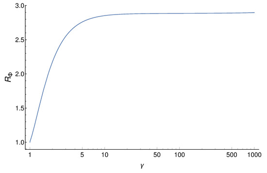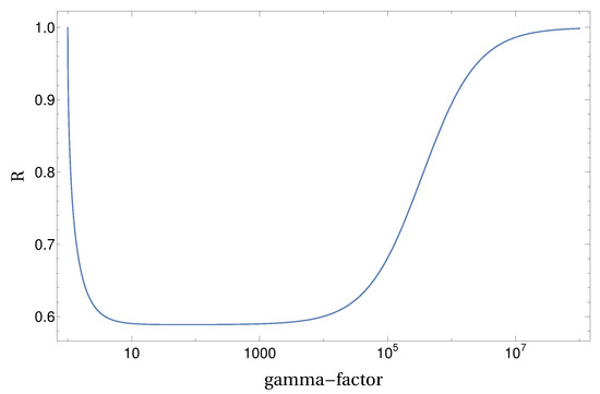 Figure 2 shows the dependence of this ratio R from the gamma factor of the initial electron. At , corresponding to , Equation (2) takes the form