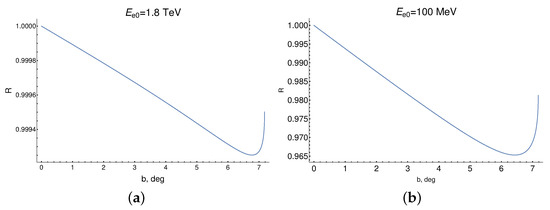 Ratio R for maximal energy from upper hemisphere to the one from lower hemisphere dependent on latitude b for and initial electron with energy of 1.8 TeV (a) and 100 MeV (b).