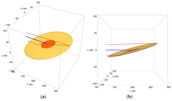 Scattering scheme in the dark disk case, in perspective (a) and from the side (b). Dark matter disk is depicted as yellow, Andromeda stellar disk as orange, blue line connects the observer with Andromeda galactic center, red lines show the trajectory of the final photon with , black lines show the initial photon paths to the scattering points necessary to achieve maximum final energy.