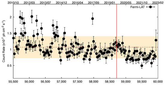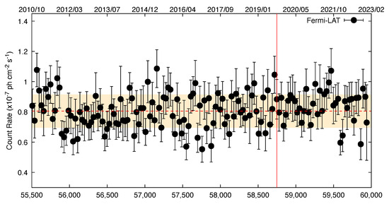 - Abdo, A.A.; Ackermann, M.; Ajello, M.; Atwood, W.B.; Axelsson, M.; Baldini, L.; Ballet, J.; Barbiellini, G.; Bastieri, D.; Baughman, B.M.; et al. Bright Active Galactic Nuclei Source List from the First Three Months of the Fermi Large Area Telescope All-Sky Survey. Astrophys. J. 2009, 700, 597–622. [Google Scholar] [CrossRef]
