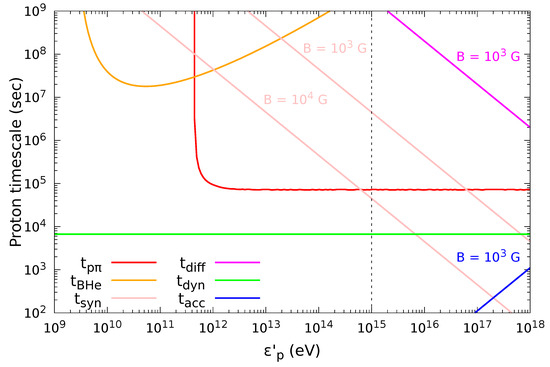 which is larger than the dynamical timescale, . However, note that proton synchrotron efficiency must be about if the magnetic field intensity is higher, for instance, ∼ (as the predicted by the equipartion condition indicated by Equation (2). This efficiency is similar to that for gamma-ray luminosity produced by secondary electrons is for .