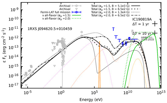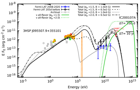 - Petropoulou, M.; Oikonomou, F.; Mastichiadis, A.; Murase, K.; Padovani, P.; Vasilopoulos, G.; Giommi, P. Comprehensive Multimessenger Modeling of the Extreme Blazar 3HSP J095507.9+355101 and Predictions for IceCube. Astrophys. J. 2020, 899, 113. [Google Scholar] [CrossRef]