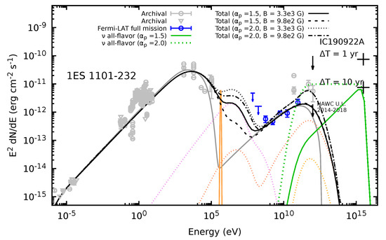 - Cao, G.; Wang, J. The Hadronic Origin of the Hard Gamma-ray Spectrum from Blazar 1ES 1101-232. Astrophys. J. 2014, 783, 108. [Google Scholar] [CrossRef]