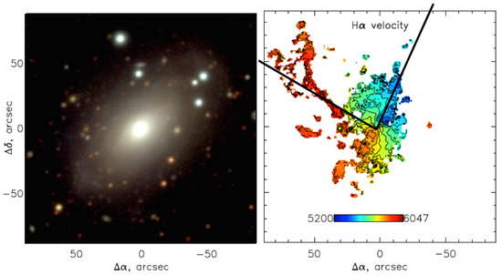 The lenticular Seyfert galaxy Mrk 6 reveals one of the most nearest and impressive cases of the intergalactic environment illumination by the AGN. Mrk 6—one of the first known Seyfert galaxies, so it seems to have been studied in great detail [14,15]: its stellar disk looks homogeneous and symmetrical. It was also known about large (up to 22 kpc) ionization cone, aligned with the central radio jet [16]. However deep 3D-spectroscopic observations at the SAO RAS 6m telescope with the scanning Fabry-Perot interferometer (https://www.sao.ru/hq/lsfvo/devices/scorpio-2/ifp_eng.html, accessed on 1 December 2023) revealed a very extended system of emission filaments up to distances about 40 kpc (over 4 optical radii) from the nucleus (Figure 2). The velocity field in the H emission line showes that in the inner regions the rotation of ionized gas takes place in the plane of the stellar disk. The differences in the radial velocities of the gas from the circular rotation model here do not exceed , but outside the stellar disk the residual velocities reach . The gas is dynamically cold, i.e., it has a low velocity dispersion () and cannot be associated with jet-driven outflow [17].
