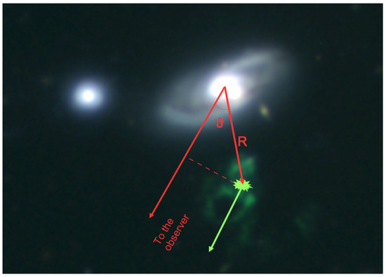 Optical image of the galaxy IC 2497 with its companion and the Hanny’s Voorwerp nebula (in green) obtained by the authors at the 6 m telescope in filters in October 2011. A geometric scheme illustrating the Equation (1) for the signal delay from the nucleus is overlapping.