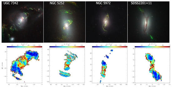 How unique is the Hanny’s Voorwerp? The first significant attempt to answer this question was made by Keel et al. [12] in the survey based on the visual examination of SDSS images by participants of the Galaxy Zoo project. They compiled a sample of all nearby () galaxies from SDSS DR7 that were either already in the AGN catalogs or whose line ratio in the SDSS spectra corresponded to possible nuclear activity—a total of 18,116 objects. A close look at the SDSS images revealed 49 candidates with suspected external emission clouds. Follow-up spectroscopy at the 2.1 m Kitt Peak National Observatory and 3 m Lick Observatory telescopes confirmed EELR ionized by AGN in 19 galaxies. It is noteworthy that all systems are either clearly interacting (at least 14/19 according [12]) or are surrounded by faint tidal structures [42]. This fact gives independent agreement with the Hanny’s Voorwerp formation scenario described in the previous section, i.e., that extended ionized gas rises from tidal off-plane structures.