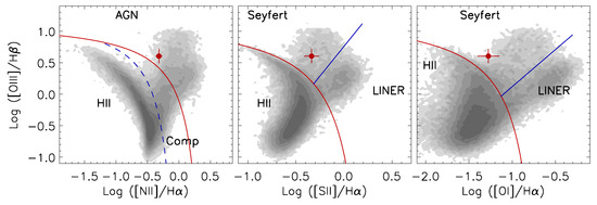 - Baldwin, J.A.; Phillips, M.M.; Terlevich, R. Classification parameters for the emission-line spectra of extragalactic objects. Publ. Astron. Soc. Pac. 1981, 93, 5–19. [Google Scholar] [CrossRef]