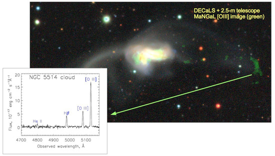 Optical image of the interacting galaxy system NGC 5514 from the DESI Legacy survey [69]. The green color shows the emission distribution in the ionized oxygen line according to the observations with the MaNGaL instrument at the 2.5m SAI MSU telescope. The gas illuminated by the AGN is visible far beyond the disks of galaxies inside the tidal arm. The box shows the spectrum of clouds obtained with the 6m SAO RAS telescope using the SCORPIO-2 instrument. The lines of the ionized oxygen and helium are visible confirming the gas ionization by the active nucleus [64].