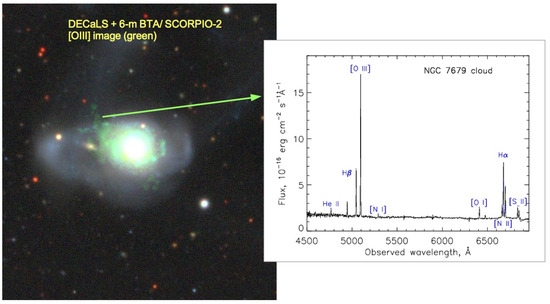 The same as Figure 6 for the galaxy NGC 7679 whereas the [O iii] image was conducted with the SCORPIO-2 at the SAO RAS 6m telescope. The AGN illuminates the gas inside the galaxy [64].