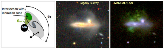 Cross-ionization in galaxy pairs based on [74]. From left to right: the cartoon explaining the geometry of the system consisting of a pair with AGN and nearby spiral galaxy, whose disk is observed from the nucleus at the angle of ; the image of pair of galaxies UGC 6081 according the DESI Legacy survey; the same field was mapped with the MaNGaL instrument on the SAI MSU 2.5 m telescope (emission in the [O iii], H and continuum in the green, red and blue channels correspondently).
