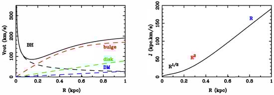 How does the angular momentum increase in radius around a super-massive black hole(BH)?: (left) the typical rotation curve in a spiral galaxy is dominated by the BH mass in the center (Keplerian potential), then rises due to the bulge, and is finally flat due to the conspiracy of the disk and dark matter halo (DM). These various contributions are marked in different colors; (right) the corresponding angular momentum per unit mass increases with the power laws of the radius, with the first slopes being a half (Keplerian), then two and one.