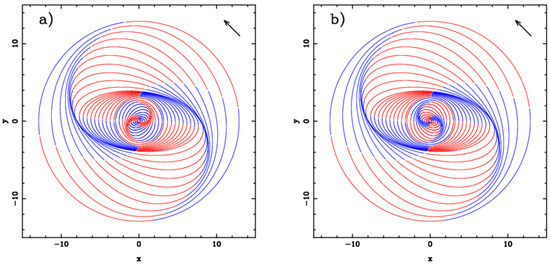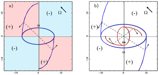 - Sanders, R.H.; Huntley, J.M. Gas response to oval distortions in disk galaxies. ApJ 1976, 209, 53–65. [Google Scholar] [CrossRef]