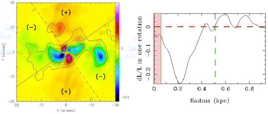 The gravity torques can be measured on real galaxies by computing the potential in each pixel and the forces from a red image (old stars), and comparing the results with the observed gas density. The (left) image is the torque map in color, with the bar splitting the plane in four quadrants, for NGC 3627. The gas density is overlaid in contours. The (right) plot quantifies the relative angular momentum lost in one rotation, while averaging the torque over the azimuth, weighted by the gas density. Adapted from Casasola et al. [9].
