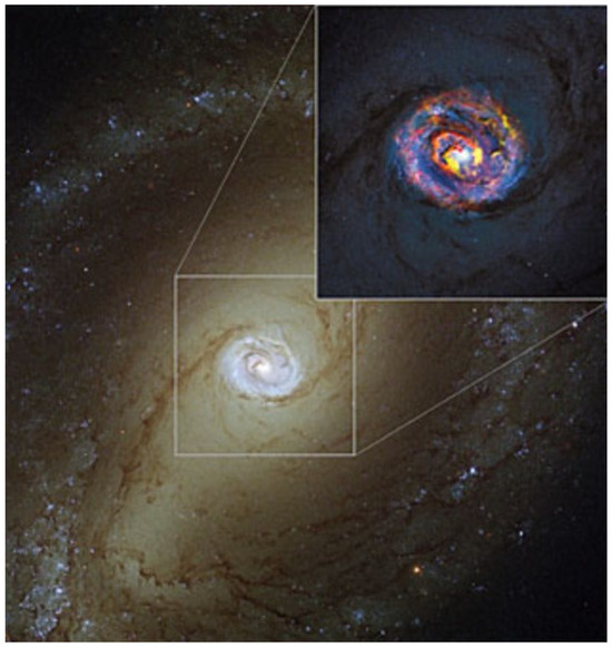 The prototypical Seyfert 2 NGC 1068 has been intensively observed at a high resolution at many wavelengths. While the near-infrared clearly reveals a hollow polar cone in warm dust [27], the cold component in the millimeter domain reveals a molecular torus of 7–10 pc in diameter [28,29]. The torus is quasi edge-on, misaligned with the large-scale disk, warped, more inclined than the water maser disk, and might suffer from counter rotation [29,30]. In contrast, the barred Seyfert 1 galaxy NGC 1097, using ALMA at 10 pc resolution, does not show any dense and compact torus. There is a nuclear spiral inside the star-forming ring at the ILR of the bar [31,32]. The absence of torus concerns about 10–20% of low-luminosity AGN. This percentage increases with the Eddington ratio, and could be related to the AGN feedback [24].