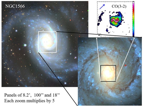 The barred spiral galaxy NGC 1566 reveals several embedded structures, as seen in these three progressively zoomed images. The last one reveals a trailing nuclear spiral in the molecular gas, traced by its CO(3-2) emission observed with ALMA. Adapted from Combes et al. [18].