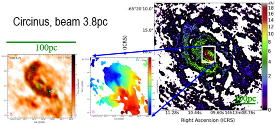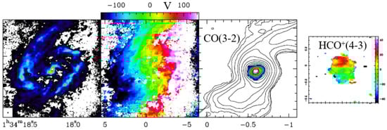 Figure 8 shows that the molecular torus, inserted in the nuclear spiral, has a decoupled kinematics, i.e., the kinematic major axis is not aligned with that of the large-scale disk [21,22].