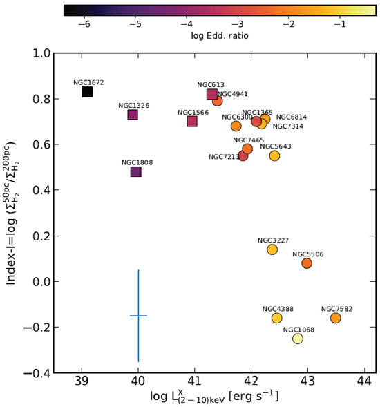 Concentration of molecular gas in the central regions of galaxies versus their AGN luminosities measured in the 2–10 keV X-ray band. The concentration is measured using the ratio of the average H surface densities at two spatial scales, r < 50 pc and r < 200 pc, characteristic of the nuclear and circumnuclear regions. Symbols are color-coded as a function of the Eddington ratios. The sample galaxies: NUGA (square markers) and GATOS (circle markers) can be separated both by their AGN activity and molecular gas concentration. Adapted from García-Burillo et al. [24].