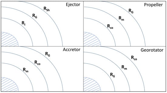 Magneto-rotational evolution is partly driven by the internal physics of NSs (e.g., field decay) and partly by the interaction of an NS with the surrounding medium. Typically, NS activity (particles wind, electromagnetic radiation, magnetic field) works against a tendency of external matter to penetrate down to the NS surface either due to gravity or simply ram pressure. This counterbalance of external and internal forces determines the stage of evolution of an NS. Here we use the following classification (see, e.g., Ref. []): ejector, propeller, accretor, and georotator. Transitions from stage to stage can often be specified in terms of the equality of some specific radii, see Figure 1. Let us define the most important of them.