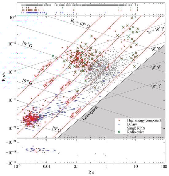 Spin periods and their derivatives for 3473 pulsating neutron stars collected in the ATNF Pulsar Catalogue. Middle panel: Classical single rotation-powered pulsars are indicated by grey dots; red circles mark sources with high-energy pulsed emission; green crosses indicate radio quietness, while horizontal blue stripes are for pulsars in binary systems. Lines of constant surface magnetic fields Gs, ages and luminosities are also drawn assuming km and g cm2. Bottom panel: Sources with negative are shown in the same coordinates. Most of these pulsars are in globular clusters and their “negative spin-down” is due to the Shklovskii effect []. The pulsar graveyard border is plotted according to Ref. []. Upper panel: Vertical lines show the spin period values for pulsars for which has not yet been estimated. Grey lines are for all such objects, green ones mark the values for radio-quiet sources, red ones are for those exhibiting high-energy emission, while blue lines are for pulsars in binary systems.