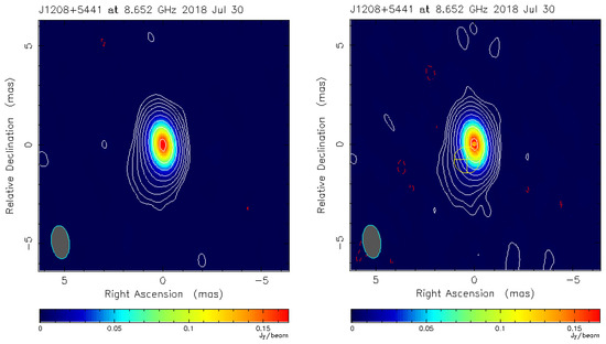 The calibrated VLBI data are available from the Astrogeo archive (http://astrogeo.org/ (accessed on 20 January 2024) and https://astrogeo.smce.nasa.gov/vlbi_images/ (accessed on 20 January 2024)).