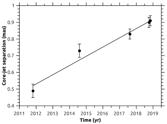 Based on our fitted brightness distribution models (Table 2), the angular separation between the core and J2 components monotonically increased from 2011 to 2018, consistently with an outward jet motion. The values are plotted in Figure 2. Assuming there is a linear change in the core–jet separation, the apparent proper motion of J2 is mas yr−1. Extrapolating back in time, the component ejection could have occurred around the year 2002.