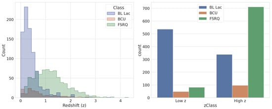 (Left) Histograms of the redshifts for FSRQs, BL Lacs and BCUs taken from 4LAC-DR3 catalog [,]. (Right) The number distributions of FSRQs, BL Lacs and BCUs in the high redshift () and low redshift () regimes.
