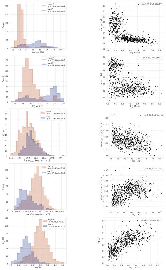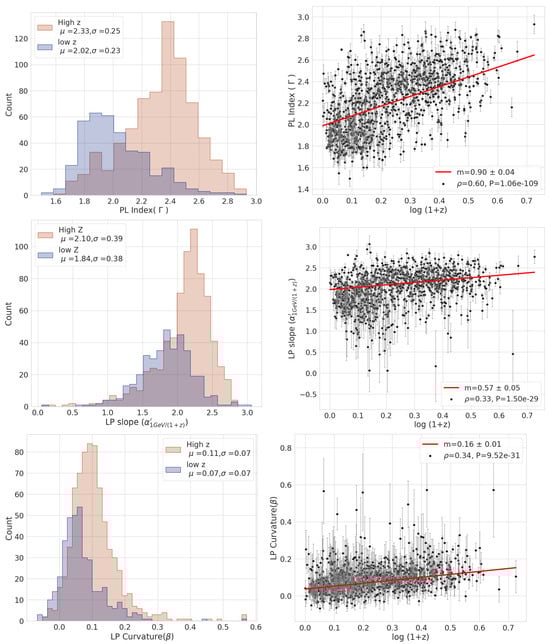 spectral models. Here, K is the flux density (erg ), is the pivot energy (in MeV) at which the error in differential flux is minimal, is PL spectral index, is LP index and is the LP curvature parameter. For a fair comparison, we have calculated the modified LP index () by computing the slope of the LP spectrum at energy 1 GeV/(1 + z). This energy corresponds to the photon energy of 1 GeV in the source rest frame. Therefore, represents the slope of the observed spectrum at the energy corresponding to 1 GeV in the source frame. Left panels in Figure 2 show distributions of , and for high and low-z blazars. The two sample Kolmogorov–Smirnov (K-S) test results in p-values of ≈0 for all three parameters. This suggests that distributions of , , and parameters are intrinsically different for high and low-z blazars. A Gaussian fit to these distributions gives mean and standard deviation, , values of 2.33 ± 0.25 (2.02 ± 0.23), 2.10 ± 0.39 (1.84 ± 0.38), and 0.11 ± 0.07 (0.07 ± 0.7) for , and , respectively, in case of high-z (low-z) blazars. The right panels in Figure 2 depict variations of these parameters as a function of (log (1 + z)). Pearson correlation analysis shows that , and parameters are positively correlated with (log (1 + z)) with the correlation coefficient () values of 0.6, 0.33, and 0.34, respectively, and p-values of ≈0. Therefore, blazars at higher redshifts will have softer -ray spectra (higher values of and ) and with more curvature (higher values of ) than low-z blazars. Similar correlations have also been obtained between BL Lacs and FSRQs in the literature [,]. This may be the manifestation of the underlying particle spectrum involved in the HE emission (detail discussion in Section 4.7) and absorption of HE -ray photons by EBL via - pair production during their propagation from source to the observer [,]. The absorption probability of HE photons traveling over cosmological distances is characterized by optical depth () or opacity, which strongly depends on z, -ray photon energy (E) and density of EBL photons [,]. The EBL absorption effects start dominating at energies above 30 GeV for redshifts beyond []. Therefore, the intrinsic (emitted) -ray spectrum of the source gets modified and the observed spectrum is given as