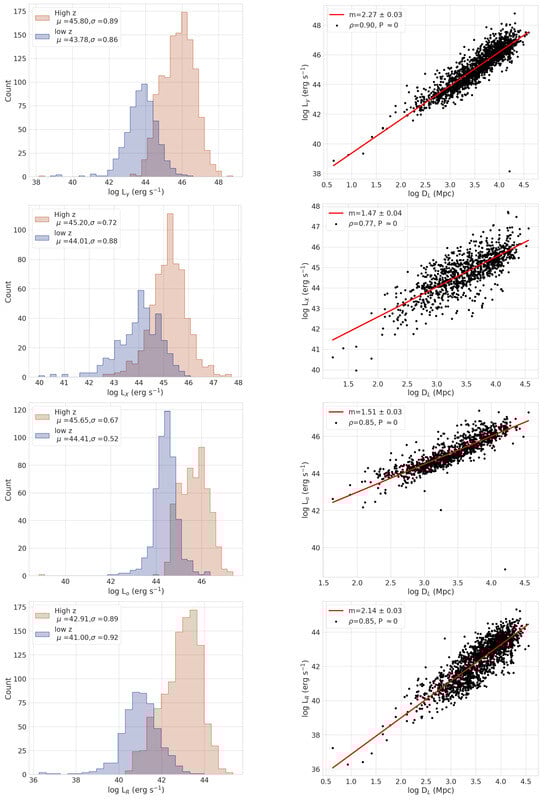 For luminosity studies, we have selected sources from the blazar emission regions catalog. Out of 1791 sources in the catalog, 1789 have -ray luminosities () at 1 GeV, 1030 have X-ray luminosities () at 1 keV, 1059 have optical luminosities () at 2.43 × Hz and 1581 have radio luminosities () at 1.4 GHz. The left panels in Figure 3 show distributions of log , log , log and log for high and low-z blazars []. The right panels represent variations of these parameters as a function of luminosity distance () measured in Mega-parsec (Mpc). Note that, is a function of z. A Gaussian fit to the distributions of log , log , log , and log gives values of 45.80 ± 0.89 (43.78 ± 0.86), 45.20 ± 0.72 (44.01 ± 0.88), 45.65 ± 0.67 (44.41 ± 0.52), and 42.91± 0.89 (41.0 ± 0.92) for high-z (low-z) blazars, respectively. We observe that, in all the wavebands considered above, high-z blazars are at least an order of magnitude more luminous than low-z blazars. All the luminosities log , log , log , and log show strong positive correlations with log having corresponding values of 0.90, 0.77, 0.85, and 0.85, respectively. We also perform a linear regression analysis of the scatter plots of these luminosities vs log . The slopes of linear regression indicate that observed , , and vary as ∼, , and , respectively. As mentioned in Section 4.1, these observed features are consistent with the fact that high-z sources with strong luminosity can only be detected due to selection bias. The high-z regime is dominated by FSRQs, which are intrinsically more luminous than BL Lacs, which are mostly observed at lower redshifts. Thus, high-z blazars (mostly FSRQs) are the most luminous sources observed in the sky across all wavebands.