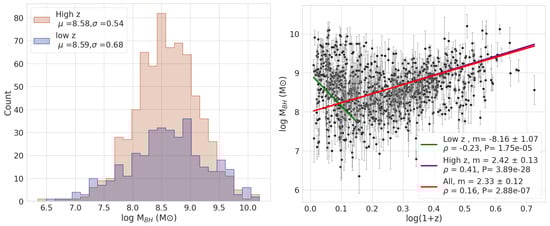 The blazar central engine consists of an SMBH at the center and an accretion disk surrounding it. It is characterized by the mass of SMBH (), accretion efficiency (), and accretion disk luminosity (). The sources in the blazar central engines catalog are considered for this study. The left panel in Figure 5 shows distribution of values for high and low-z blazars. In both the cases, values range from ∼2.5 × to ∼1.75 × . The average values for high and low-z blazars are similar with ⟨log log and standard deviations are 0.54 and 0.68, respectively, when fitted with a Gaussian function. A two sample Kolmogorov–Smirnov (K-S) test is performed to see whether the two populations of values are derived from the same parent population. The obtained p-value of 0.11 suggests that there is a high probability both samples belong to the same parent source population. However, their correlations with z are different as discussed below.