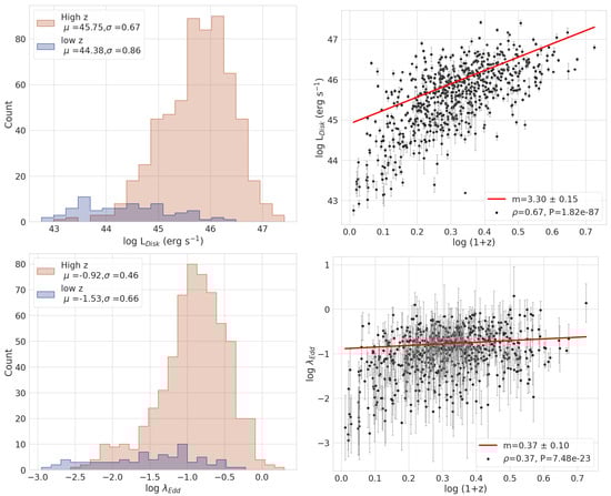 (Upper Left) Histograms of for high and low redshift blazars. (Upper Right) Scatter plot of log vs log (1 + z). (Lower Left) Histograms of the Eddington ratios () for high and low redshift blazars. (Lower Right) Scatter plot of log as function of log (1 + z).