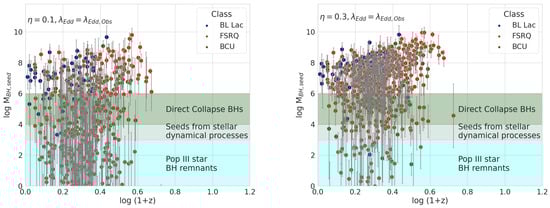 Variations of the estimated seed values at z = 30, required for the formation of observed SMBHs in blazars, as a function of log (1 + z), assuming the BH accretes with observed and with 0.1 (left panel) and 0.3 (right panel). The shaded regions correspond to expected mass ranges of Population III star BH remnants (10–; cyan color), seed black holes from stellar dynamical processes (≥; gray color) and black holes from direct collapse (–; green color).