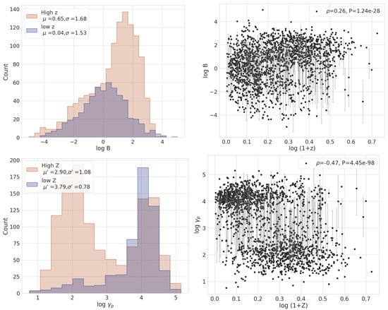 (Left) Histograms of log B and log for high and low redshift blazars. (Right) Variation of log B and log values with log (1 + z).